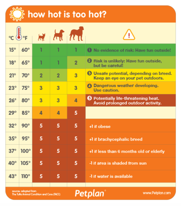 Note: The chart found above is not a reference to determine if you can leave your pet in the car in warm weather. The temperature in your car is always extremely hotter than the temperature outside.